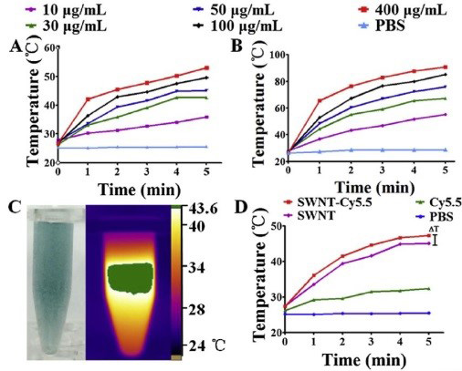 该论文报道了一种把单壁碳纳米管和近红外花菁染料偶联的光热治疗新方案。单壁碳纳米管(SWNT)是近年来生物医学领域新兴的碳材料,其安全性以及生物相容性得到界内的认可。除了力学和电学性能之外,SWNT可以吸收近红外光,将光能转化为热能,在肿瘤区域内杀死细胞。Cy5.5作为一种近红外花菁染料,在与SWNT偶联之后,可以引导术者观察SWNT的体内分布,发现肿瘤所在,指导肿瘤的光热治疗。通过光学方法对肿瘤进行成像,通过SWNT进行肿瘤细胞杀灭,提高了术后辅助治疗的效果,具有极大的临床应用潜力。