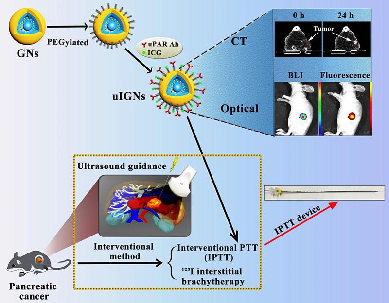 胰腺癌是一种恶性程度极高的消化道肿瘤,其手术切除率低,治疗方案(化疗、放疗等)疗效都欠佳,因此临床上需要寻找更好的治疗方案。光热疗法(PTT)作为新兴治疗方式,由于其在肿瘤方面展现的良好疗效果,已经引起人们极大的关注。然而,这种治疗方式存在光穿透性差,无法达到深部肿瘤的问题。为了解决这一问题,合作团队开展了一种可以局部介入式光热治疗(IPTT)的研究。利用Upar作为胰腺癌靶点合成纳米金壳探针uIGNs用于光热治疗,利用实验室自主研发的介入治疗设备进行介入式光热治疗胰腺癌。实验结果表明,与临床上常用的125I放射性治疗相比,IPTT疗法的平均存活率提高25%,同时抑制了胰腺肿瘤的转移。这种介入式光热疗法为胰腺癌的治疗提供新方法和新策略。该工作以标题为“A comparative study of clinical intervention and interventional photothermal therapy for pancreatic cancer”发表在Adv. Mat.( DOI:10.1002/adma.201700448)