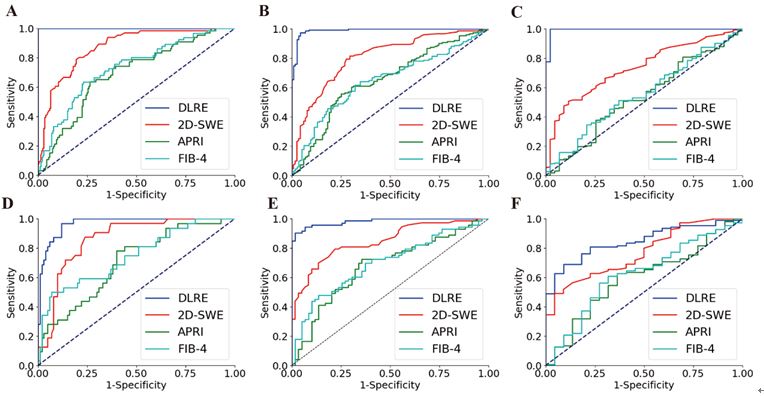 影像组学人工智能(DLRE)、超声弹性成像(2D-SWE)和血清学检测(APRI,FIB4)三种方法对于肝硬化(图A和D)、重度肝纤维化(图B和E)、显著肝纤维化(图C和F)分期诊断效能的ROC曲线对比