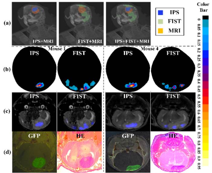 基于这一新型思路,该团队通过自主研发的MOSE光学仿真平台,提出一种新型的仿真数据构建方法,人工构建了近8000例的原位脑胶质瘤荷瘤小鼠;并基于这一数据库,构建了一种新型的机器学习方法。我们把该仿真数据构建加机器学习重建的策略统一称之为MP-IPS方法(Multilayer Perceptron-based Inverse Problem Simulation)。在人工智能模型通过该方法训练和构建完成后,研究团队构建了数十只原位脑胶质瘤荷瘤小鼠的动物模型,并对该批动物分别进行了CT-MRI-光学三个成像模态的图像扫描。通过MP-IPS方法和传统方法,分别对每只小鼠进行了生物自发光断层成像的三维可视化重建(如下图)。最终结果表明,新型人工智能方法对于脑胶质瘤的三维定位误差均小于80微米,而传统方法的定位误差为350微米以上。该项研究揭示了人工智能在提高生物医学成像的成像精度上,具有显著的优越性和应用潜力,为疾病动物模型乃至临床患者的影像学研究提供了全新的思路。