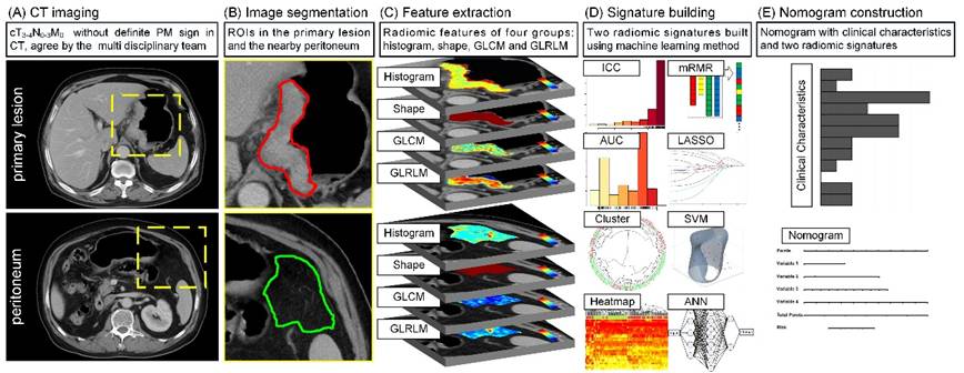 图1. 隐匿性腹膜转移预测模型构建流程。(A) 收集影像数据;(B)病灶和腹膜分割;(C)影像组学特征提?。?D)影像组学标签构建;(E)影像组学模型构建。