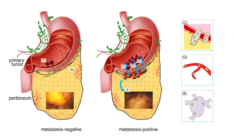 图2. 胃癌腹膜转移过程示意图。(A)胃癌原发病灶形成;(B)改变腹膜区域微环境;(C)肿瘤细胞通过脱落转移;(D) 肿瘤细胞通过血液循环转移;(E) 肿瘤细胞通过淋巴循环转移;(F)形成腹膜转移灶。