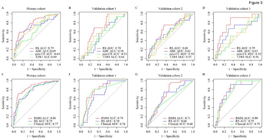 图1. 训练集和验证集中不同模型间的性能比较。A-D:单序列和多序列模型的ROC曲线;E-H:多序列影像组学标签(RS)、临床指标模型(Clinical)以及影像-临床指标组合模型(RMM)的ROC曲线。